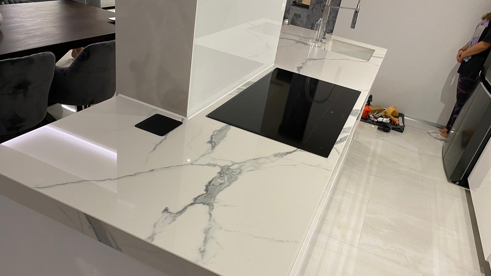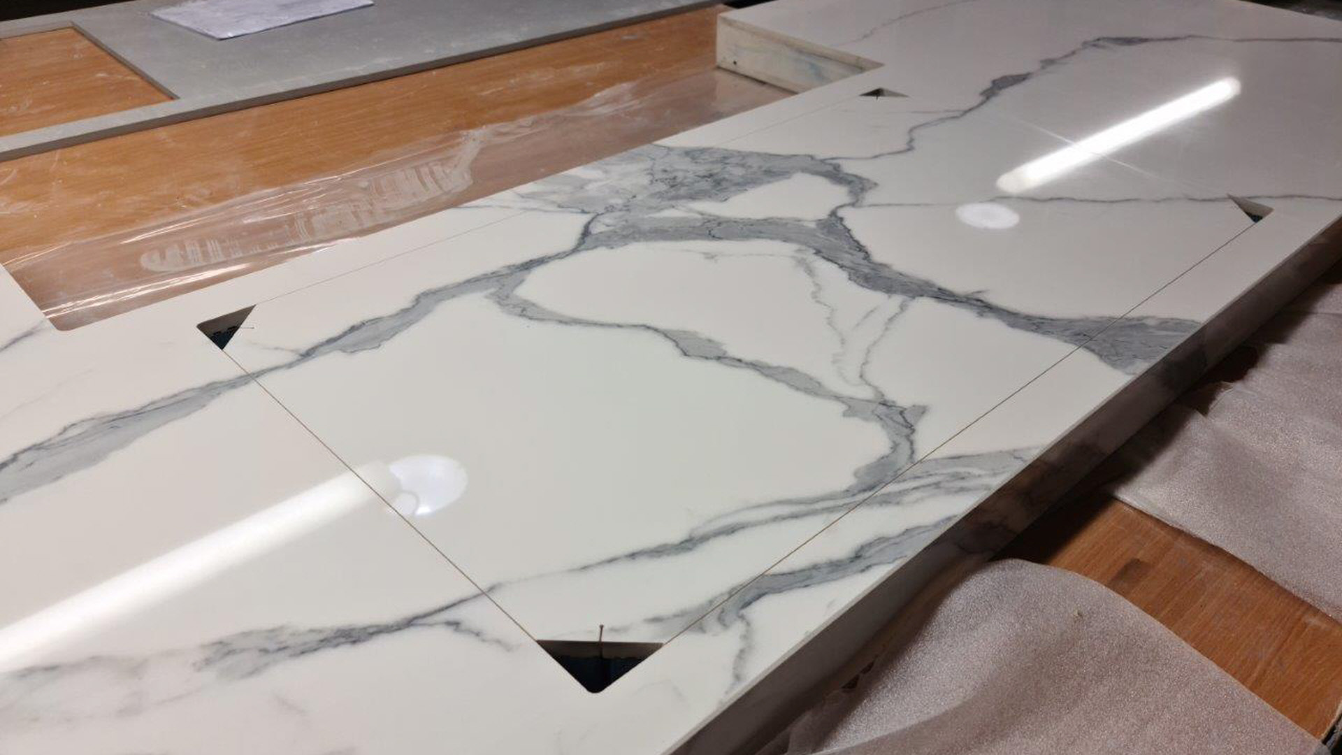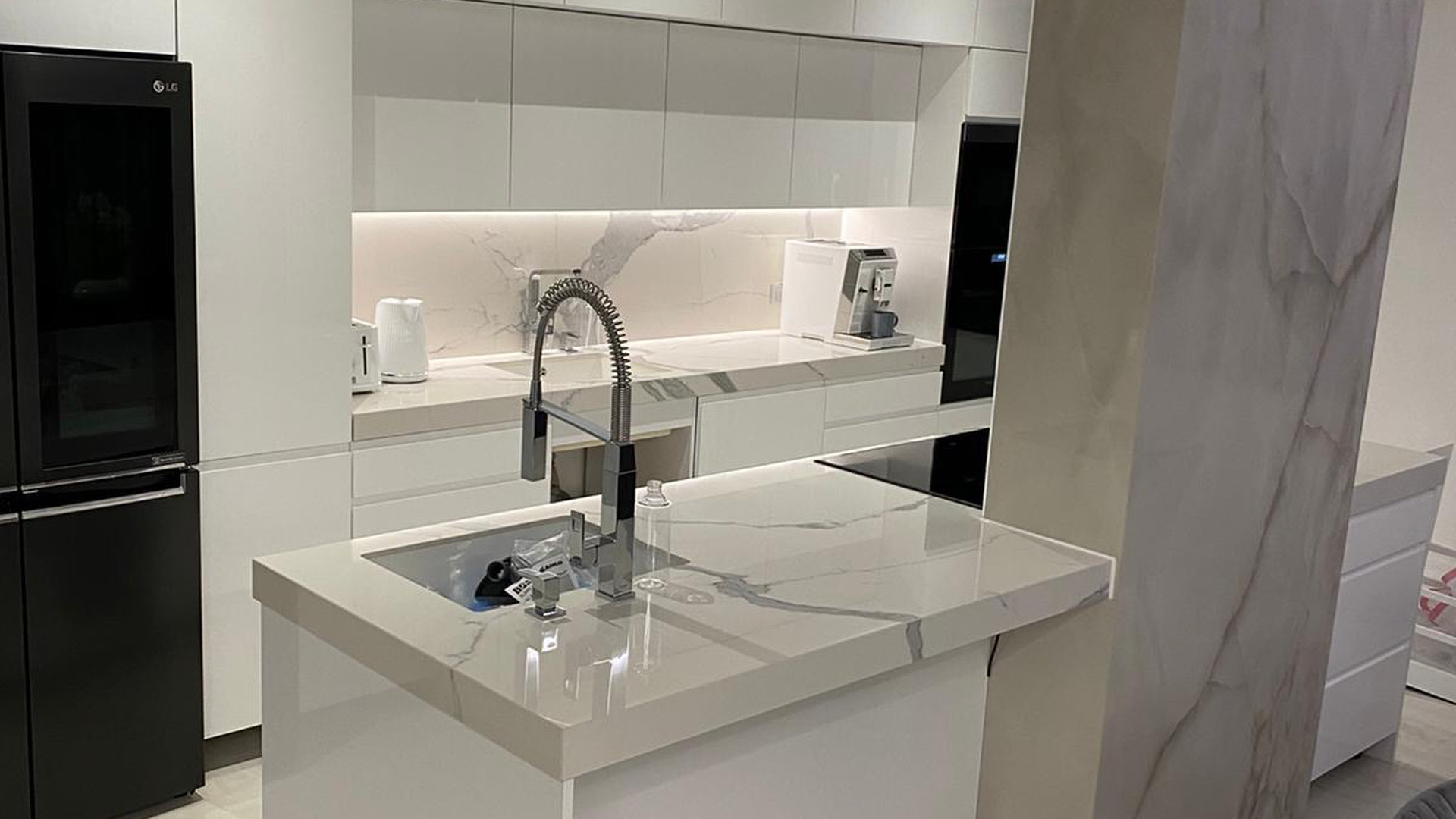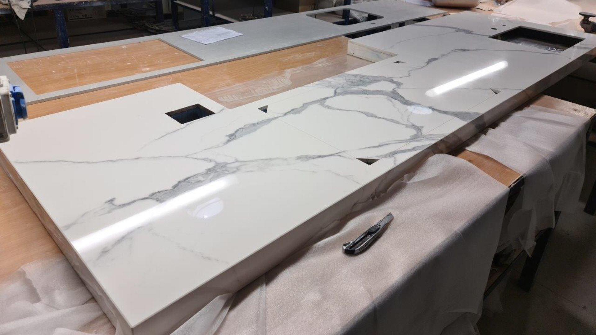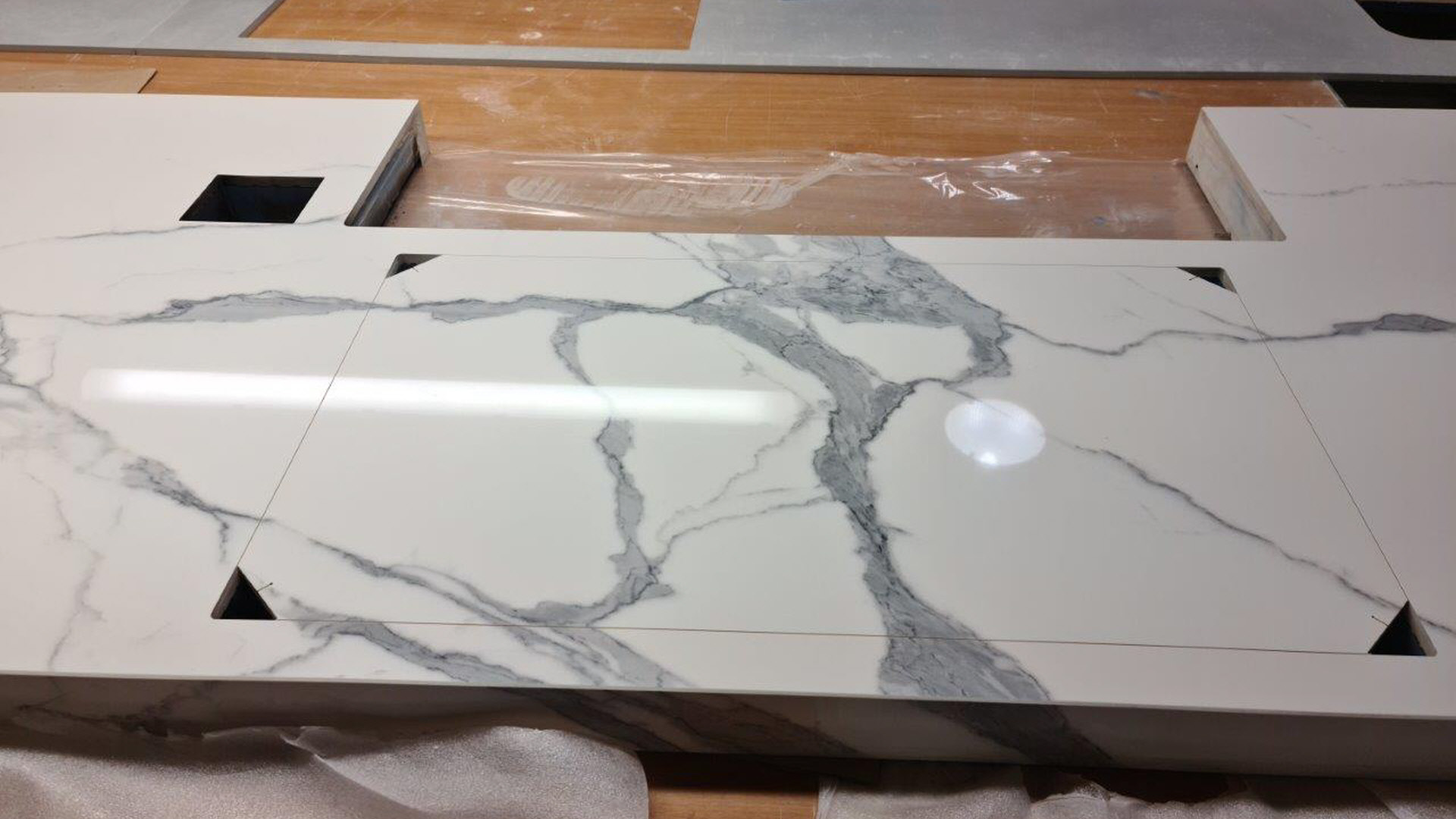 Na výrobu této kuchyňské desky byla použita dlažba v síle 12 mm a v designu Marble Statuario od italského výrobce Graniti Fiandre. Na desce byl vytvořen výřez na osazení varné desky, zaleštěný otvor pro zapuštění dřezu a samozřejmě otvory na vodovodní baterii.