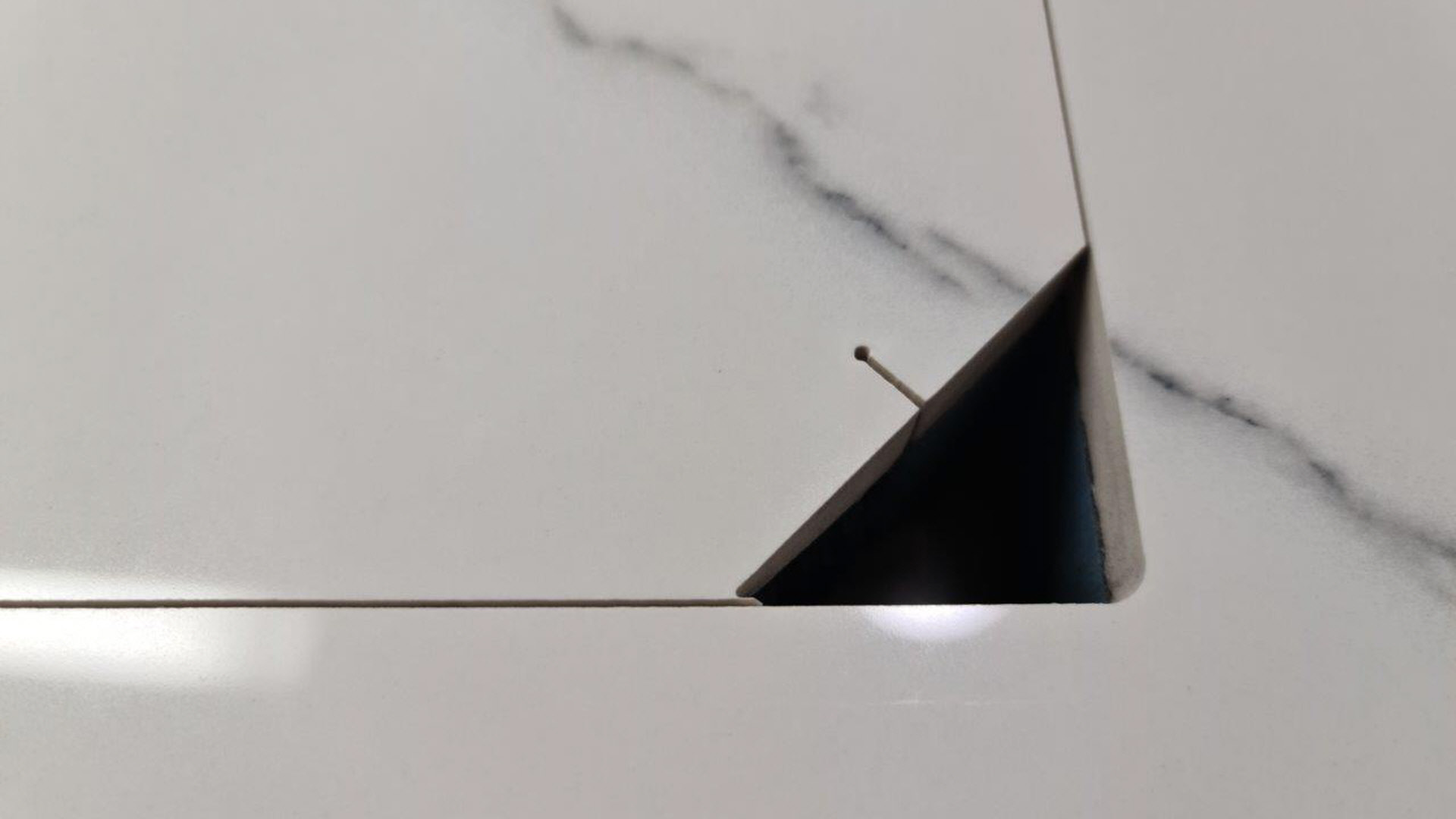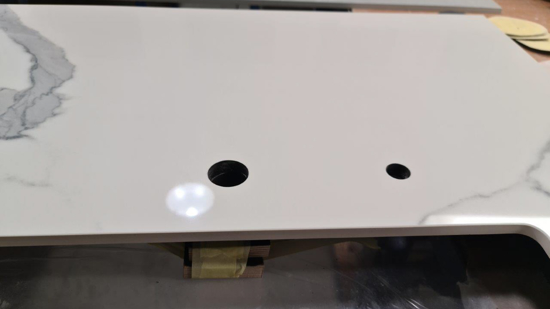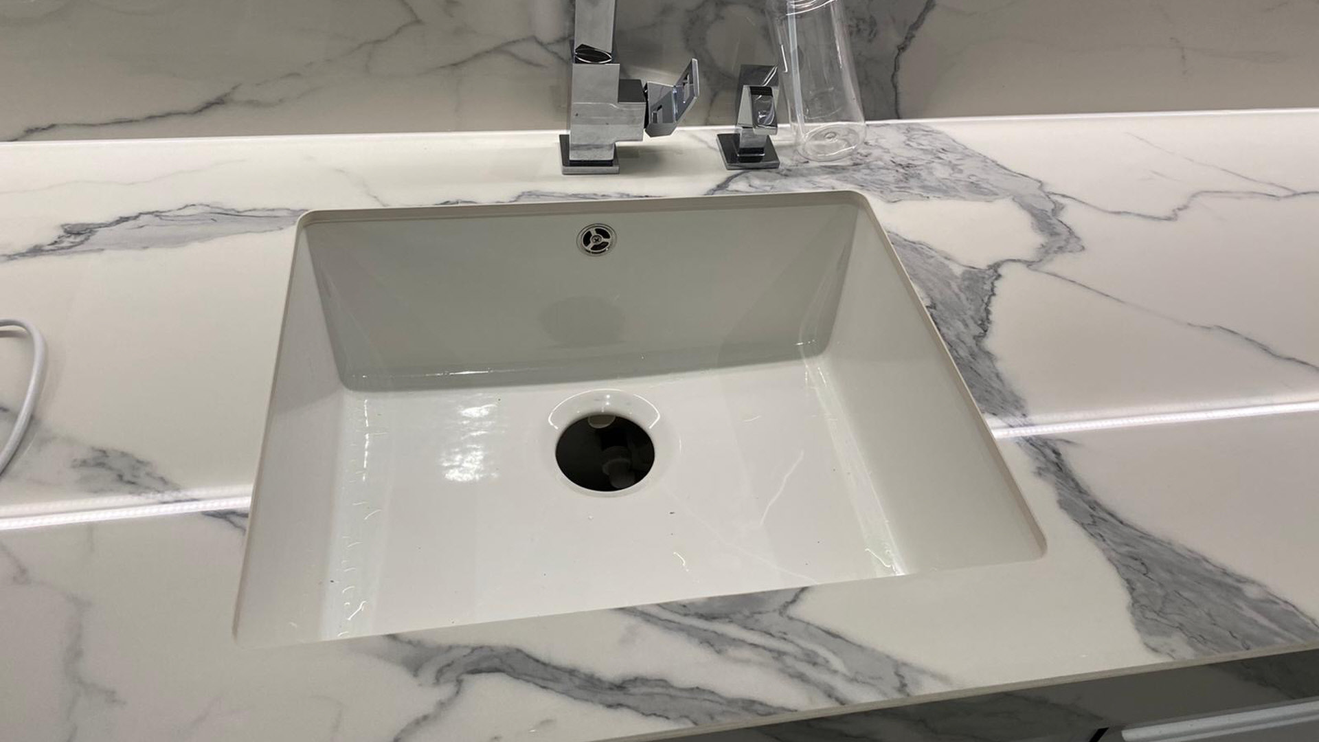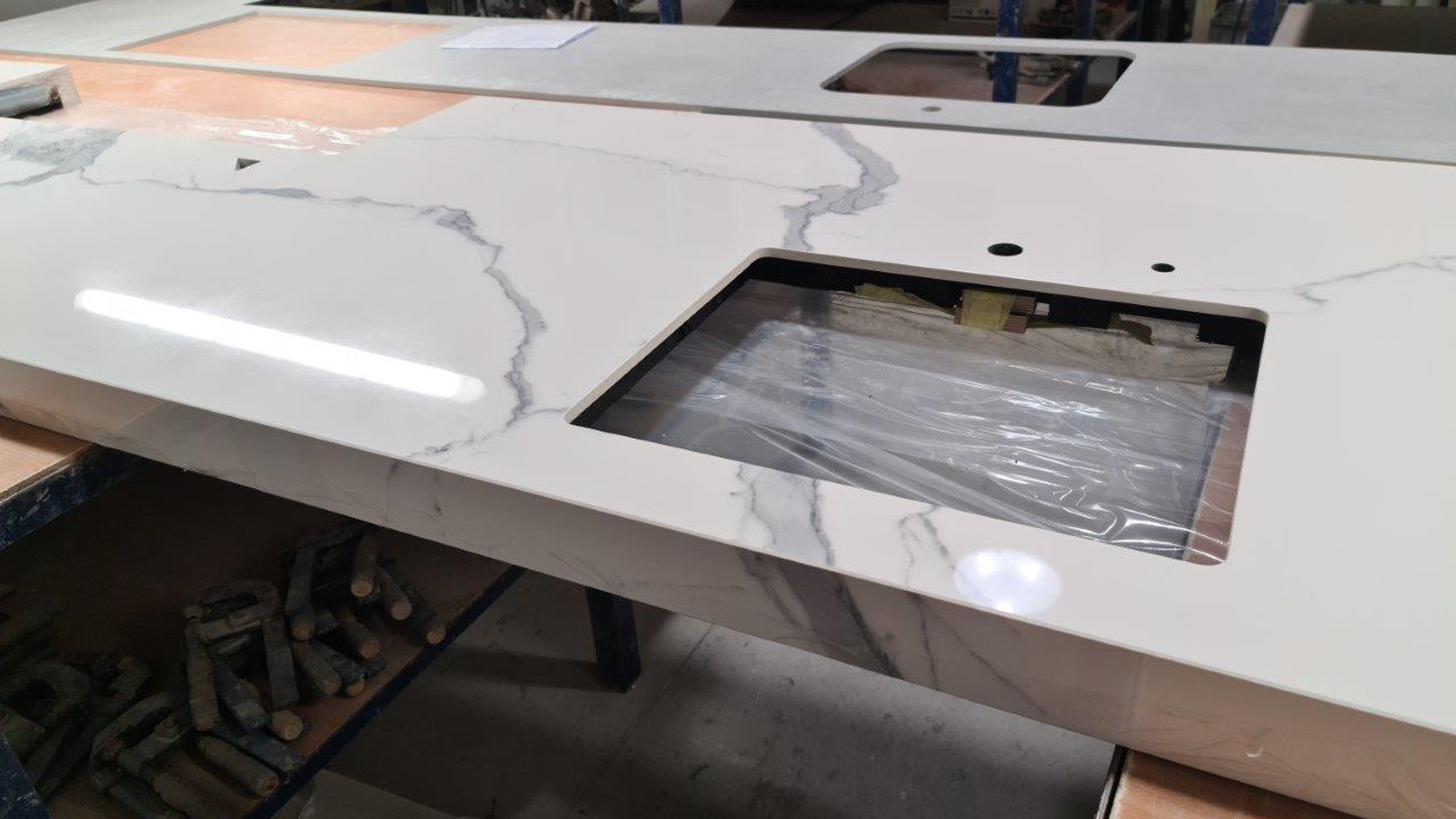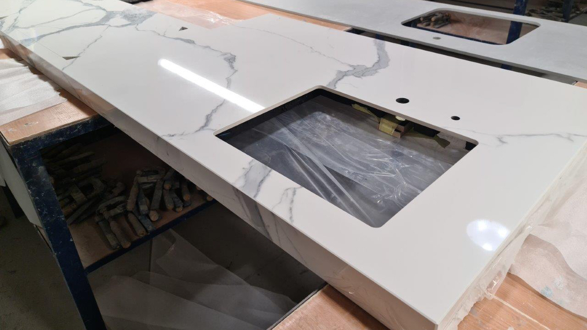 Na výrobu této kuchyňské desky byla použita dlažba v síle 12 mm a v designu Marble Statuario od italského výrobce Graniti Fiandre. Na desce byl vytvořen výřez na osazení varné desky, zaleštěný otvor pro zapuštění dřezu a samozřejmě otvory na vodovodní baterii.