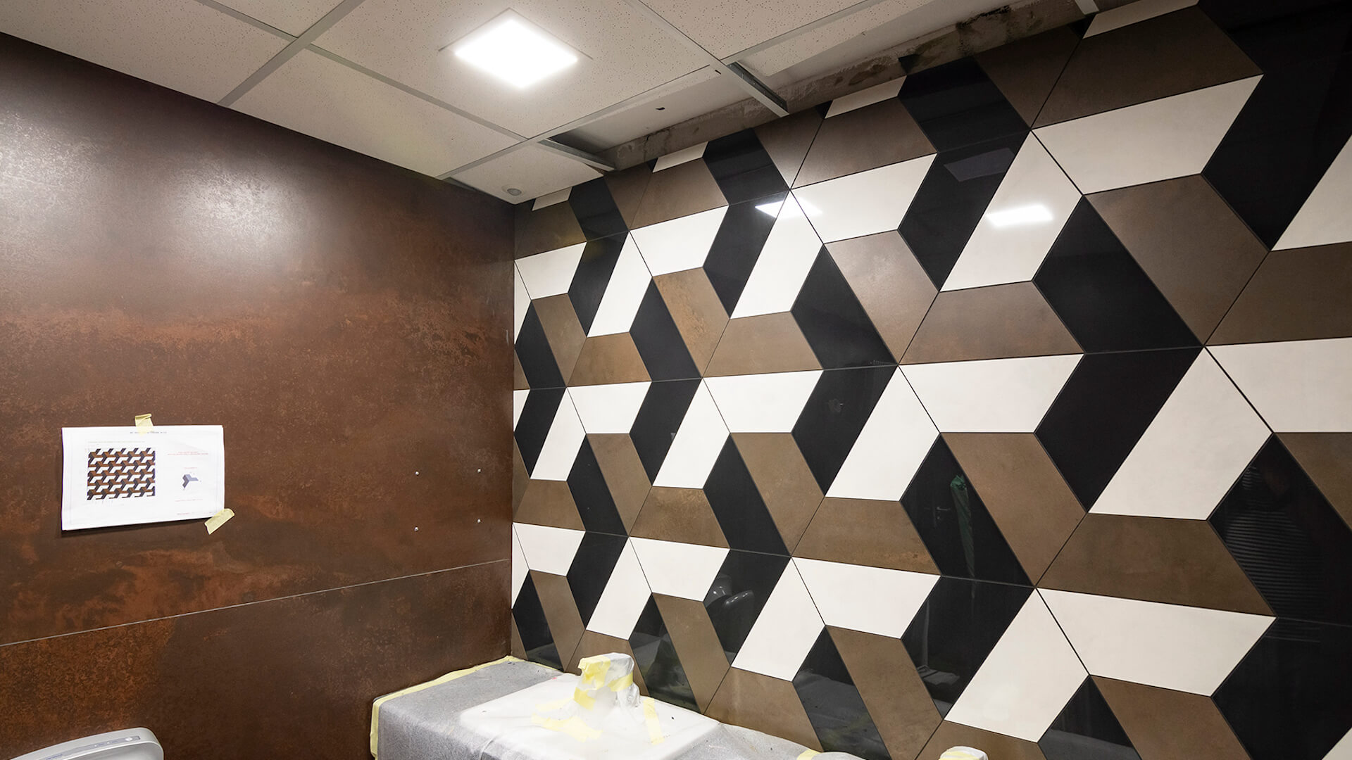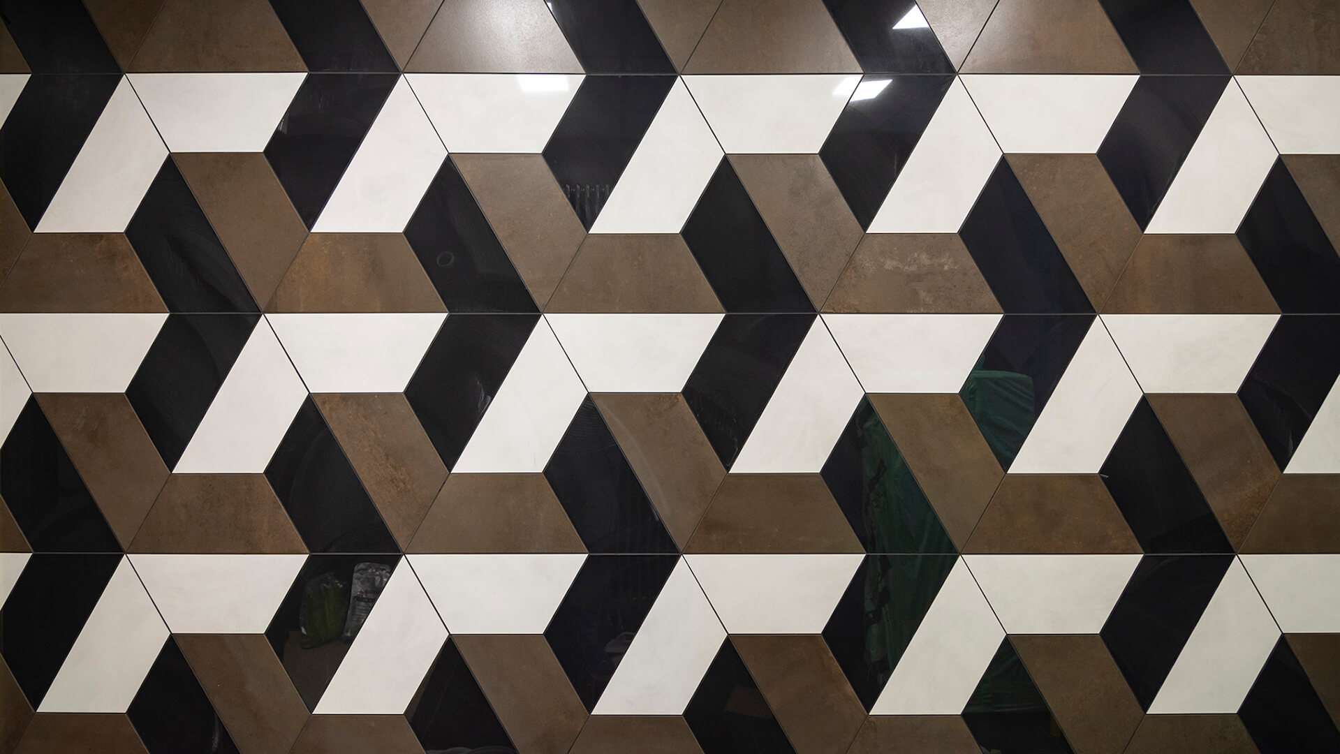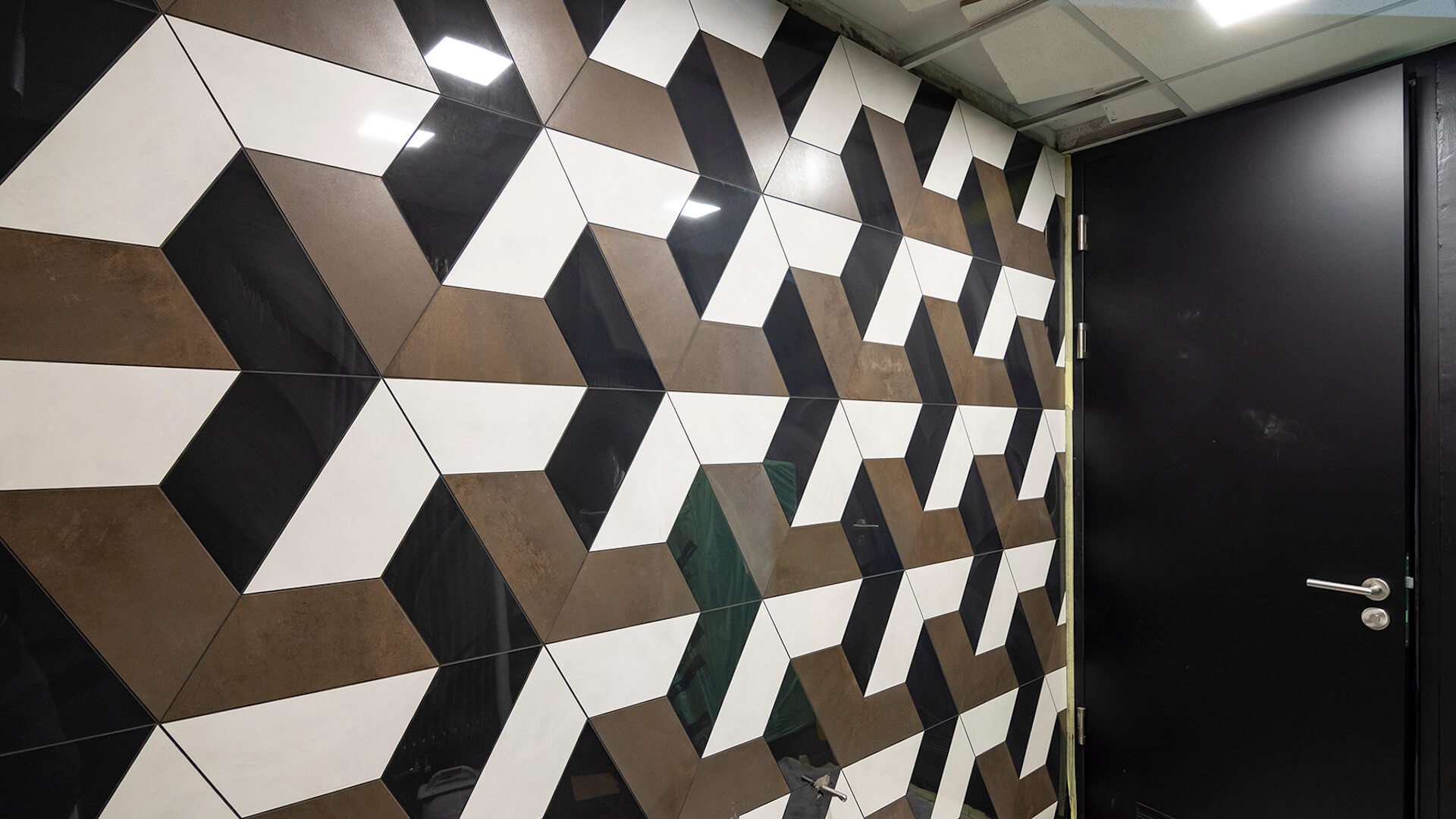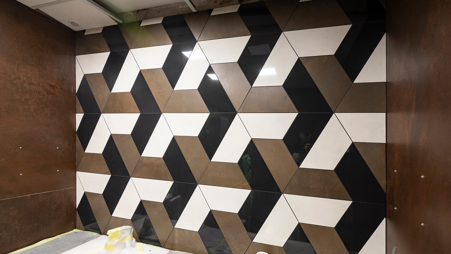 Samostatné díly mozaiky Stella jsme dodávali na zakázku do Bratislavy, kde je součástí pánských toalet. Jedná se o 3 typovou variantu, vytvářející 3D efekt.