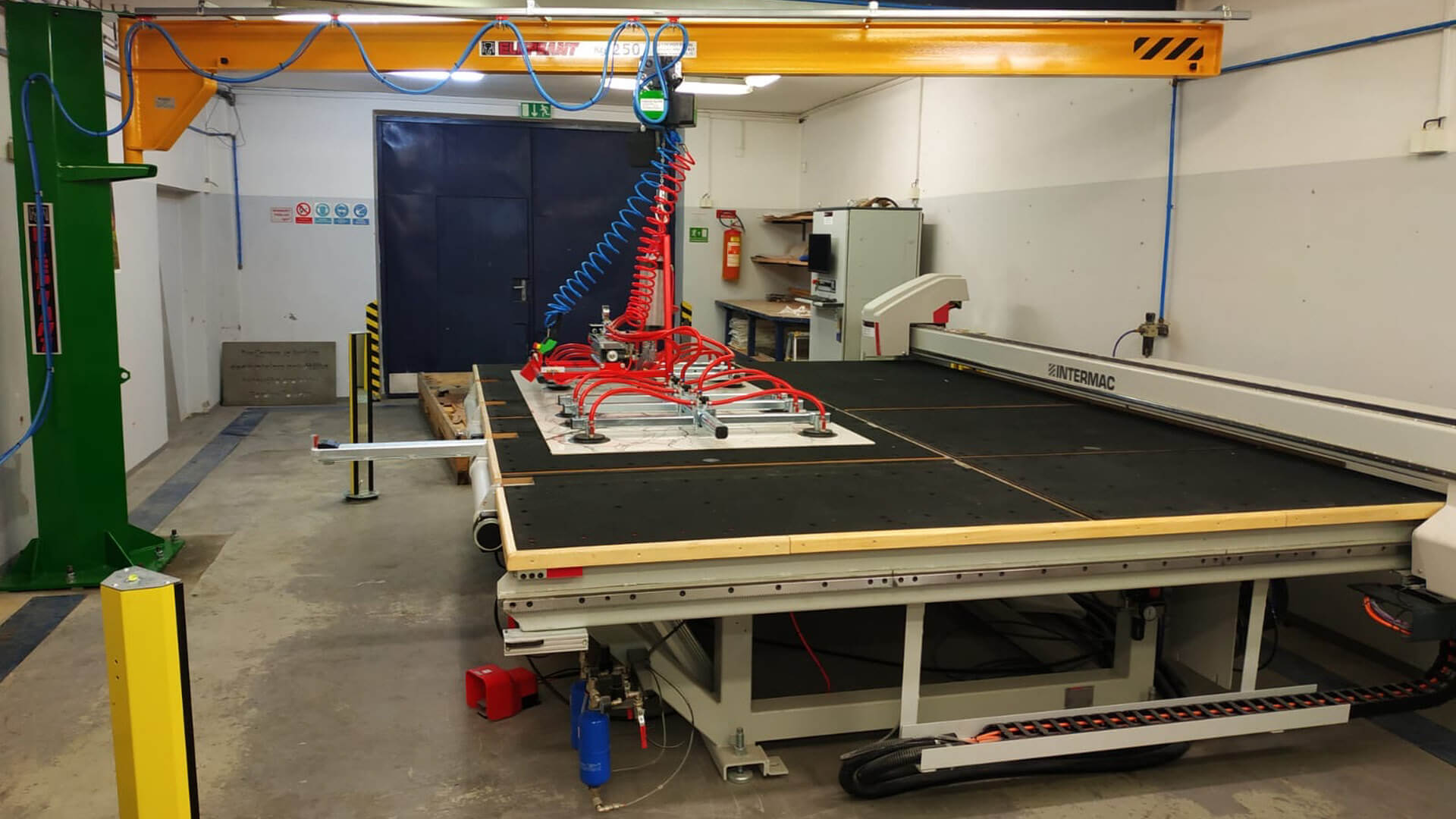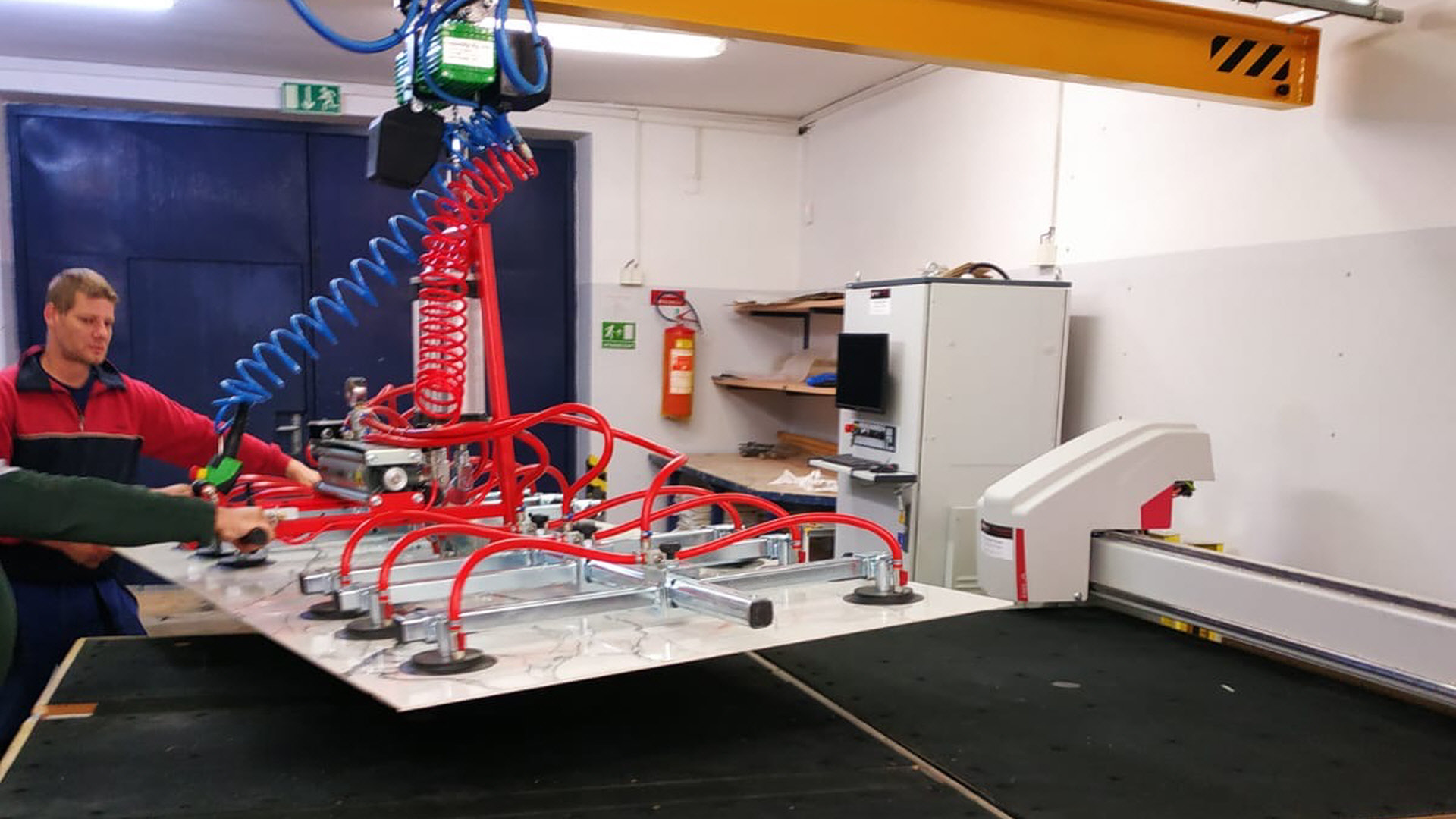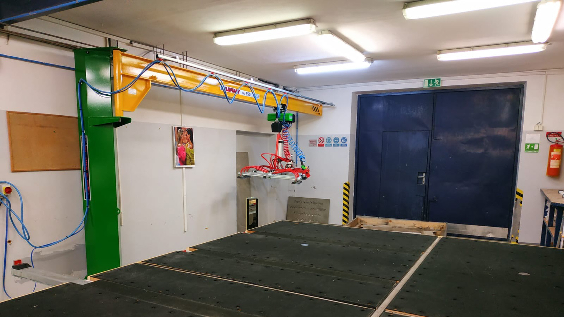 V nedávné době jsme v TechnoArtu instalovali nový sloupový jeřáb s přísavkami pro zajištění snadné manipulace s velkoformátovými deskami, které na tomto řezacím stroji Genius velice často formátujeme. Probíhají zde tedy polotovary pro další část výroby, případně již finální naformátované produkty.