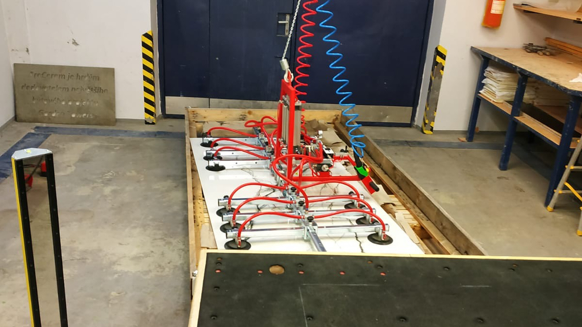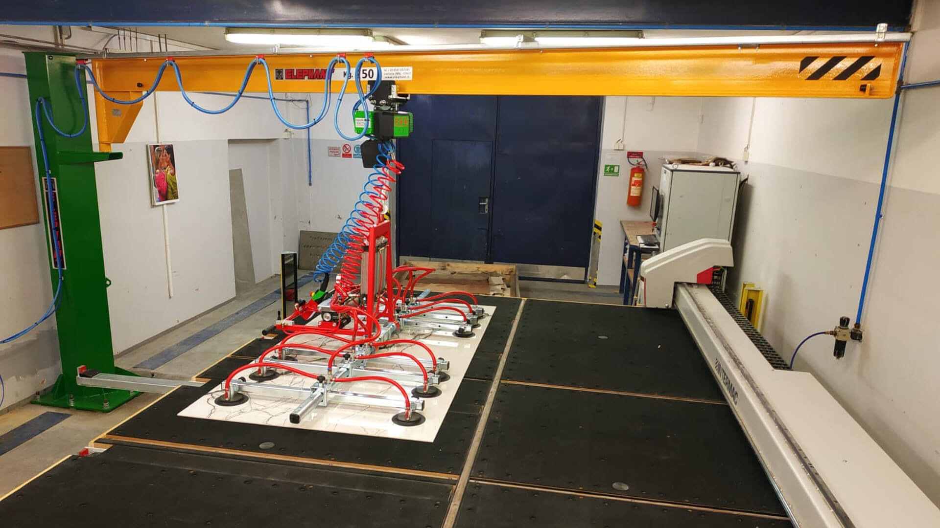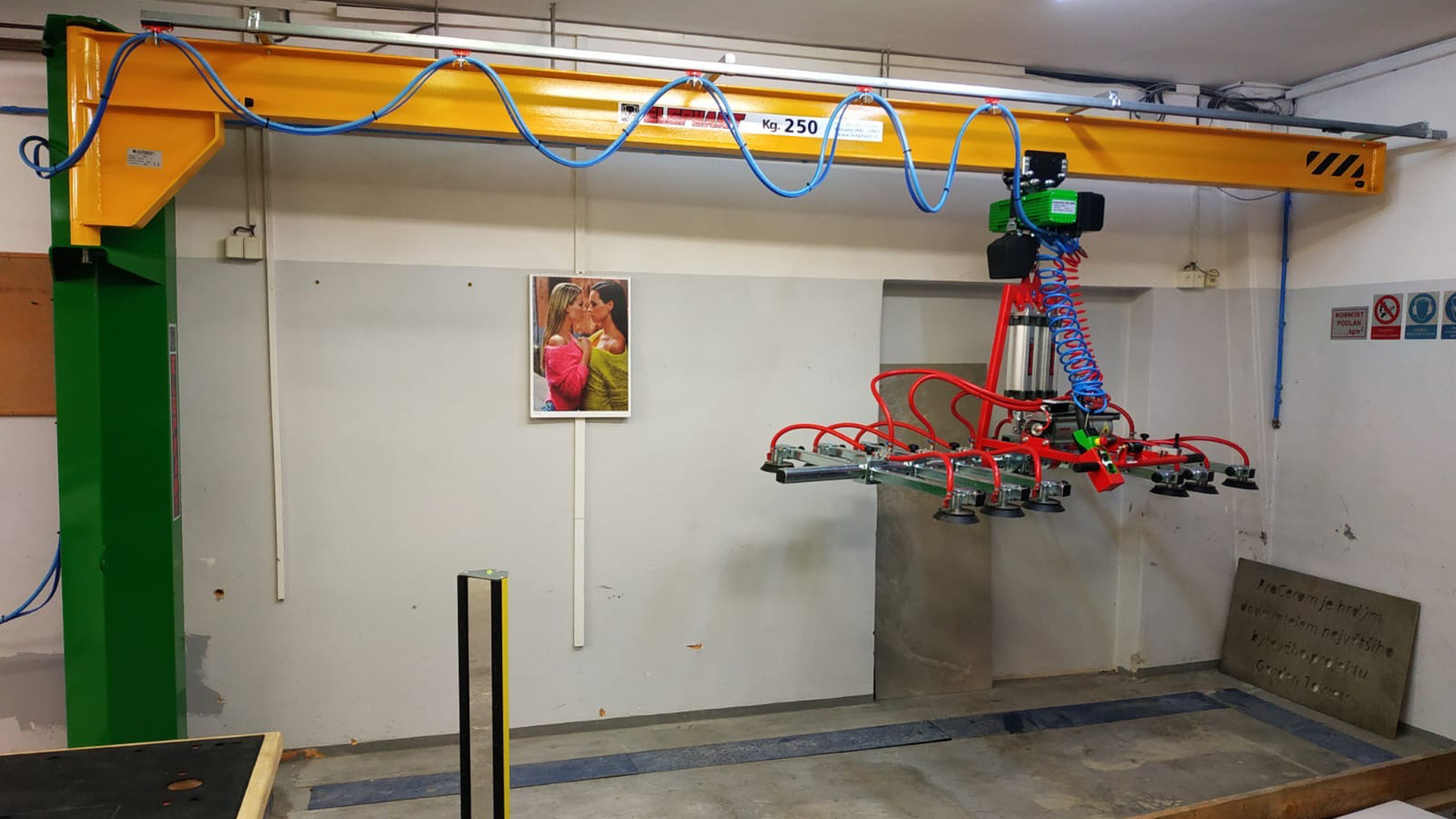 V nedávné době jsme v TechnoArtu instalovali nový sloupový jeřáb s přísavkami pro zajištění snadné manipulace s velkoformátovými deskami, které na tomto řezacím stroji Genius velice často formátujeme. Probíhají zde tedy polotovary pro další část výroby, případně již finální naformátované produkty.