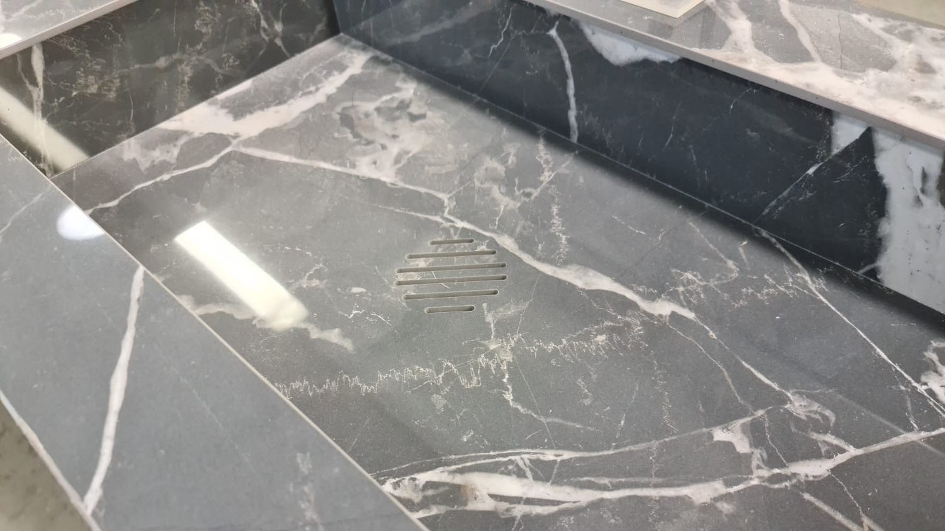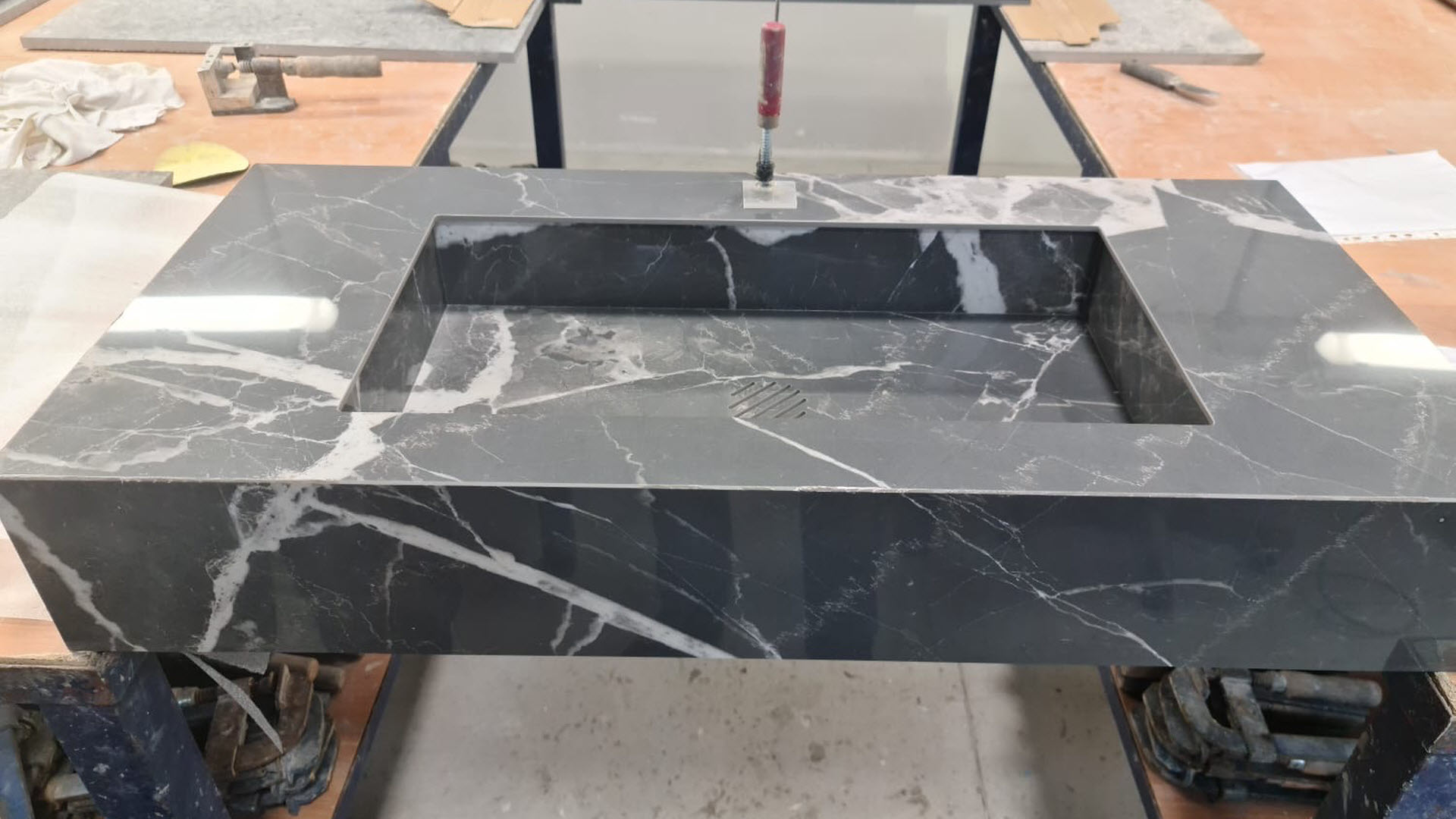 Umyvadlo Verona v rozměru 100x48x15 cm z dlažby ze Stones&More od italského výrobce Casa dolce casa, v barvě Calacata black vyrábíme pro plzeňský showroom ProCeram, kde bude následně umyvadlo ještě doplněno o koupelnovou skříňkou.